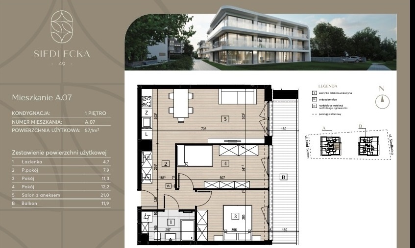 Mieszkanie o powierzchni 57,1 m2 składa się z :