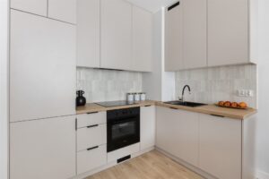 Standard wykończenia: – Nowoczesna zabudowa kuchenna z pełnym sprzętem AGD (piekarnik, płyta indukcyjna, zmywarka, lodówka),