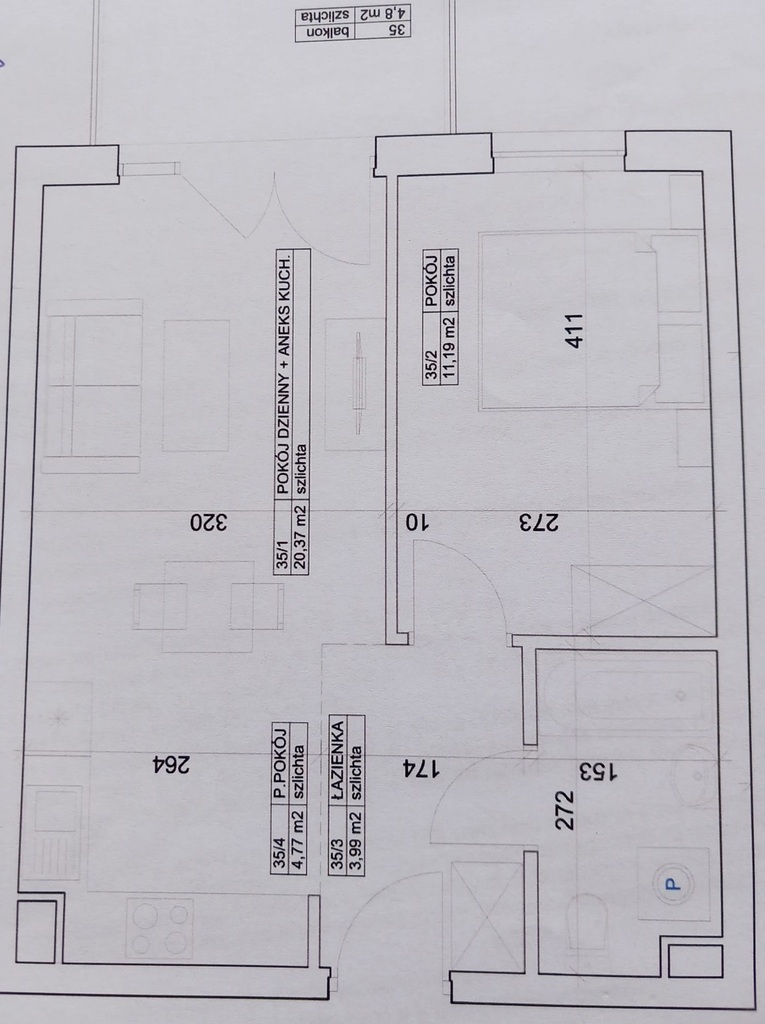 Układ mieszkania: – Salon z aneksem kuchennym i wyjściem na balkon,