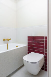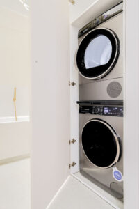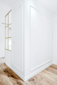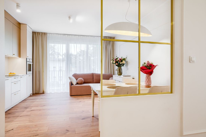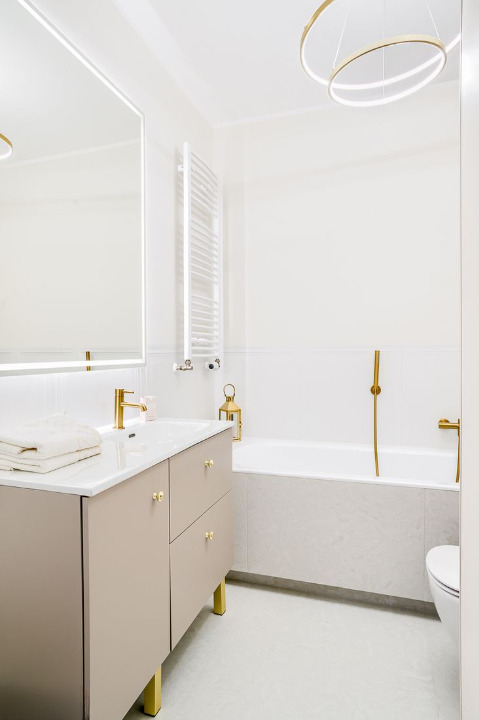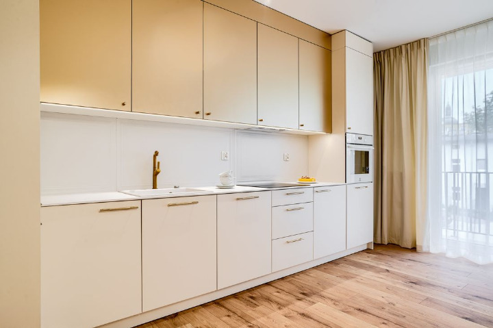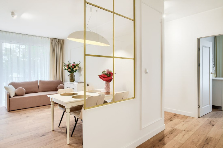 – Podłogi i ściany: Panele o podwyższonej odporności na wilgoć w całym apartamencie; ściany pomalowane wysokiej klasy farbami zmywalnymi.