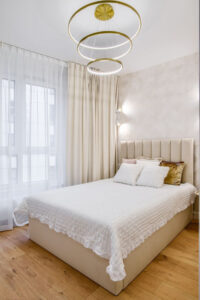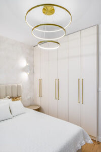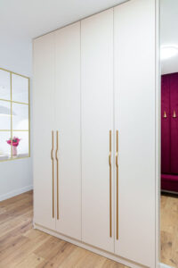– Meble na wymiar: Wszystkie zabudowy stałe, meble kuchenne, łóżko w sypialni oraz elementy tapicerowane zostały spersonalizowane i wykonane na zamówienie pod konkretne wymiary tego wnętrza.