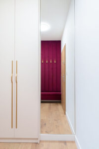 – Komunikacja: Przedpokój z funkcjonalnymi szafami i ścianką loftową.