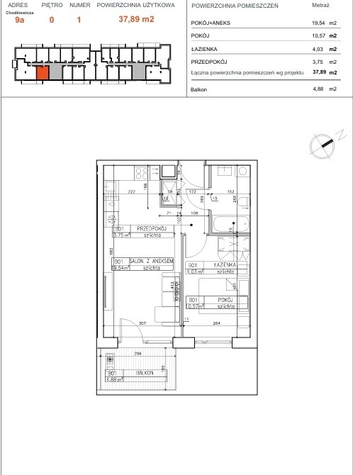 Powierzchnia użytkowa o metrażu 37,89  obejmuje: