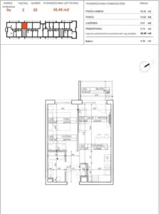 Powierzchnia użytkowa o metrażu 36,46 m² obejmuje: