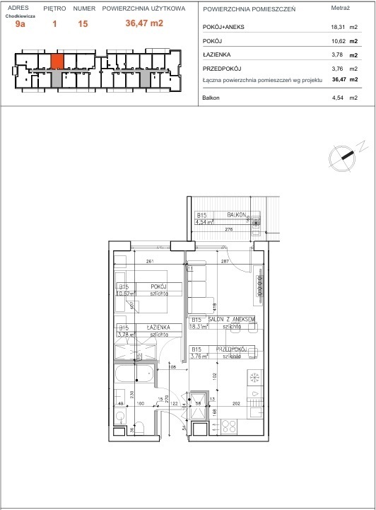 Powierzchnia użytkowa o metrażu 36,47 m² obejmuje: