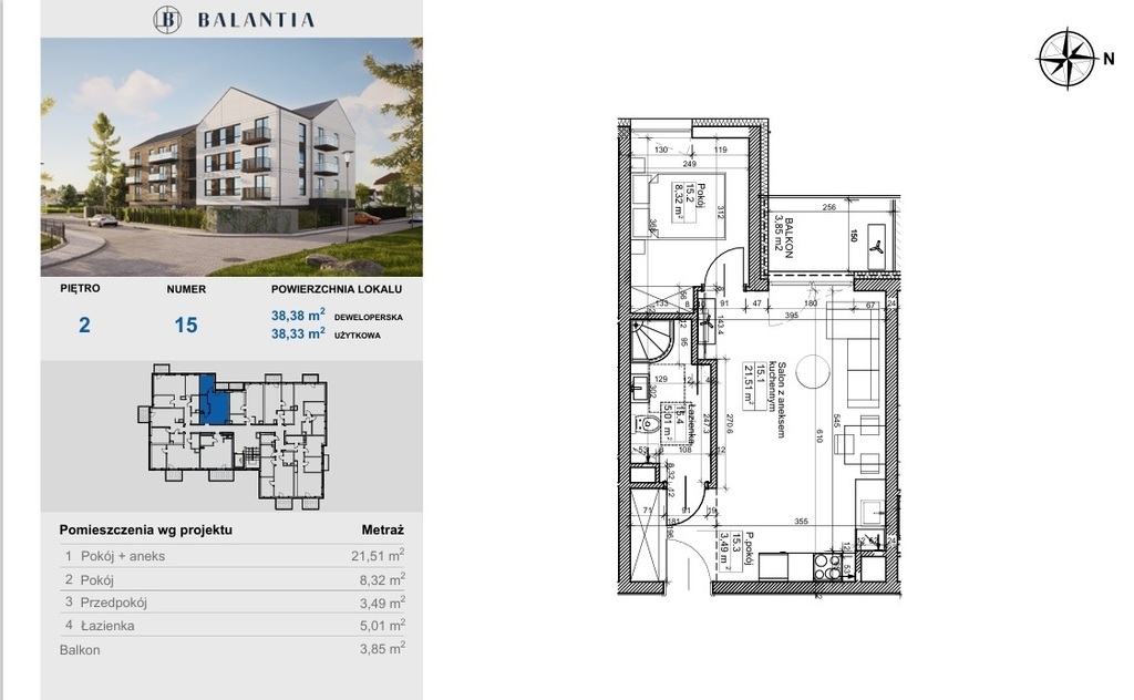 Funkcjonalna przestrzeń 38,33 m² obejmuje: