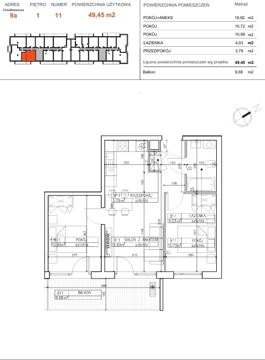 Powierzchnia użytkowa o metrażu 49,45 m² obejmuje: