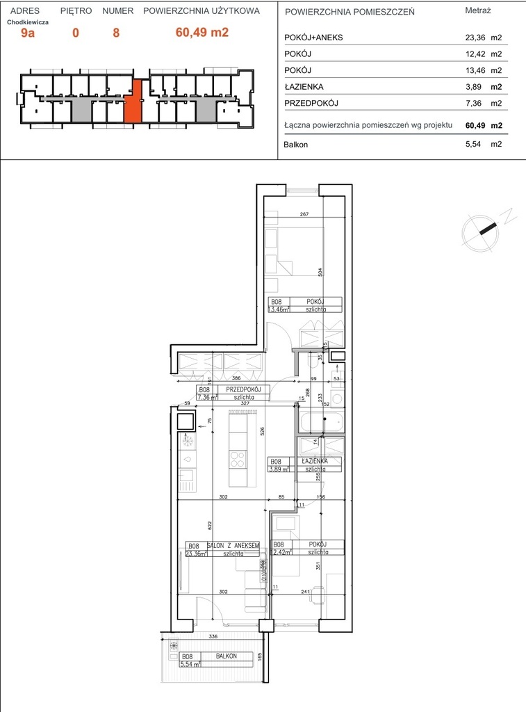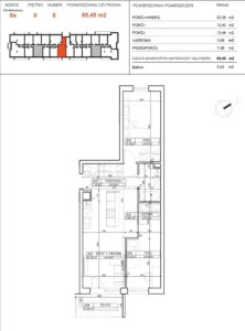Powierzchnia użytkowa o metrażu 60,49 m² obejmuje: