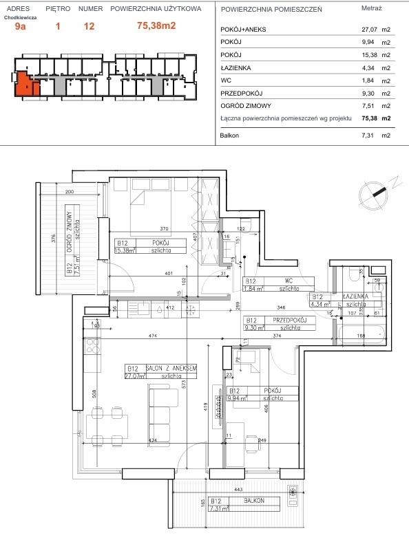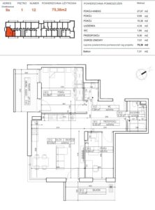 Powierzchnia użytkowa o metrażu 75,38 m² obejmuje: