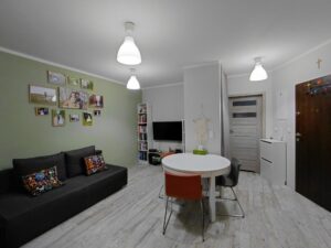 – przestronny pokój dzienny z aneksem kuchennym – wygodna strefa do życia i pracy,