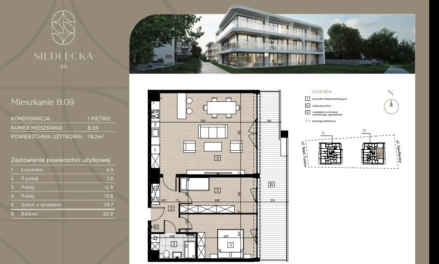 W ramach inwestycji powstaną dwa eleganckie, niskokondygnacyjne budynki, które pomieszczą łącznie 37 komfortowych apartamentów o powierzchniach od 37 m² do 105 m². Mieszkania na parterze będą wyposażone w prywatne ogródki, idealne do relaksu na świeżym powietrzu, natomiast lokale na piętrach zyskają przestronne tarasy z nowoczesnymi szklanymi balustradami.
