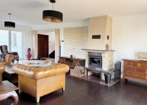 – W salonie kominek z nawiewem dodatkowe źródło ciepła, rozprowadzony po nie których częściach domu