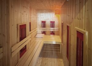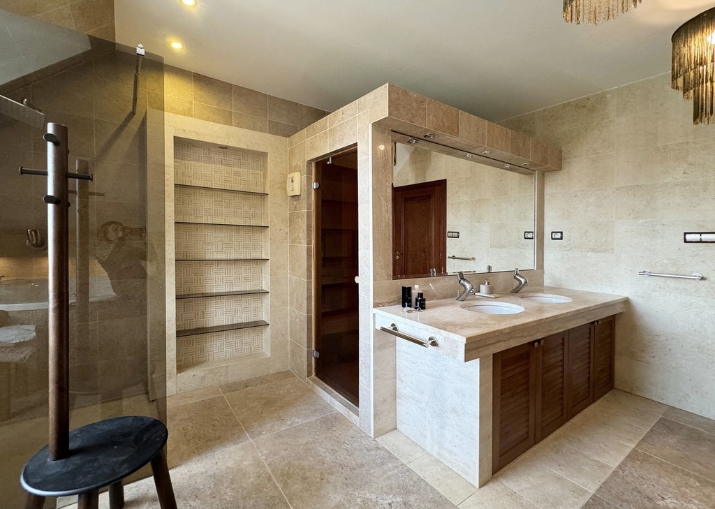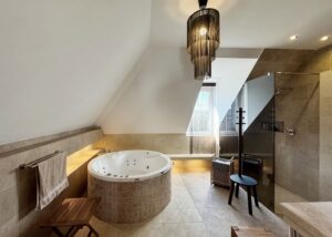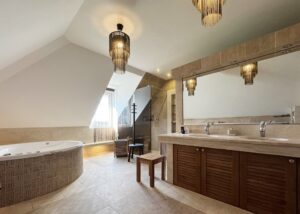 – Pokój kąpielowy z wyposażony w dużą wannę z hydromasażem, prysznic, bidet oraz saunę na podczerwień
