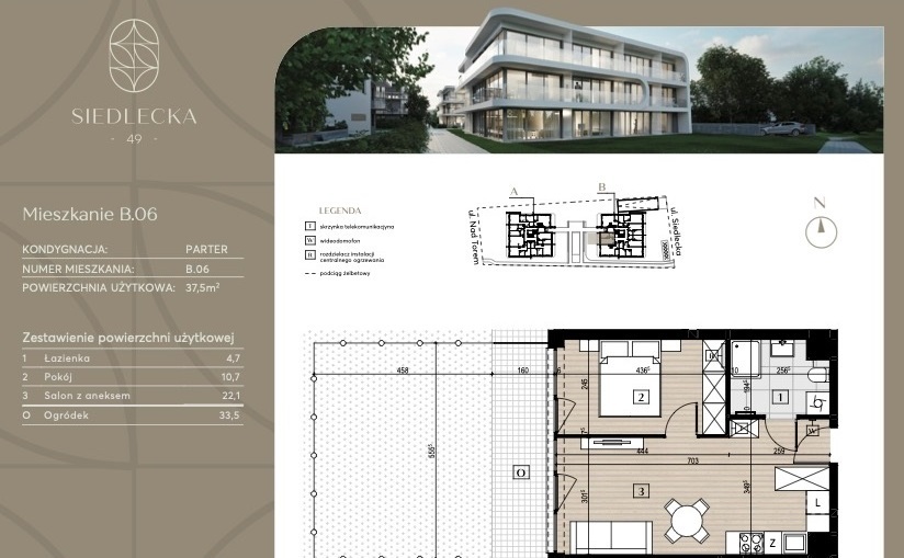 W ramach inwestycji powstaną dwa eleganckie, niskokondygnacyjne budynki, które pomieszczą łącznie 37 komfortowych apartamentów o powierzchniach od 37 m² do 105 m². Mieszkania na parterze będą wyposażone w prywatne ogródki, idealne do relaksu na świeżym powietrzu, natomiast lokale na piętrach zyskają przestronne tarasy z nowoczesnymi szklanymi balustradami.