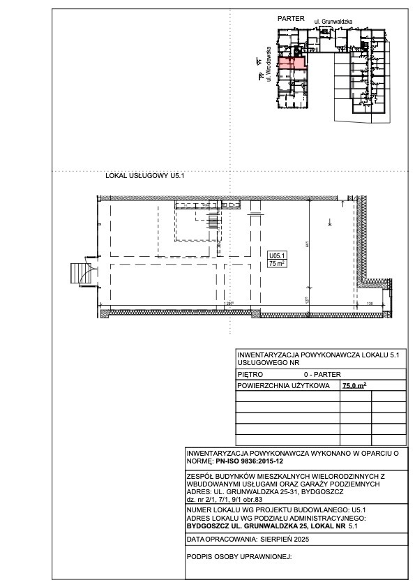 Ten nowoczesny lokal użytkowy o powierzchni 75 m² spełni oczekiwania nawet najbardziej wymagających przedsiębiorców, zlokalizowany w nowoczesnej inwestycji Grunwaldzka 25 Apartamenty – przy skrzyżowaniu ulic Grunwaldzkiej i Wrocławskiej w Bydgoszczy. To miejsce, gdzie codziennie przewijają się setki potencjalnych klientów. Doskonała ekspozycja, nieustanny ruch pieszy i samochodowy oraz szybki dojazd w każdą część miasta czynią tę lokalizację prawdziwym magnesem dla biznesu.