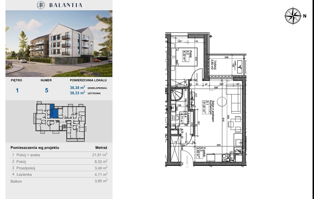Funkcjonalna przestrzeń 38,33 m² obejmuje: