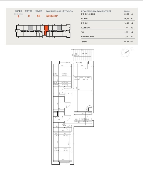 Powierzchnia użytkowa o metrażu 59,83 m² obejmuje: