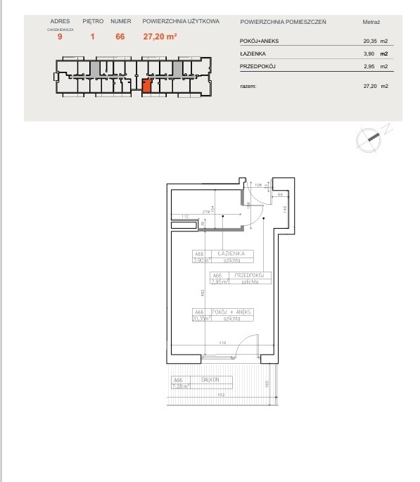 Powierzchnia użytkowa o metrażu 27,20 m² obejmuje: