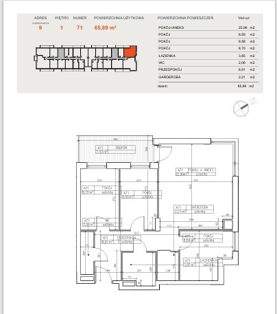 Powierzchnia użytkowa o metrażu 65,89 m² obejmuje: