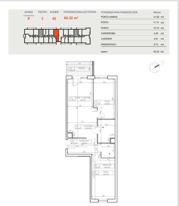 Powierzchnia użytkowa o metrażu 60,32 m² obejmuje: