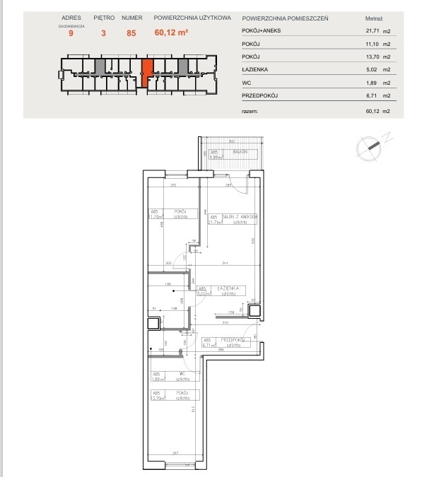 Powierzchnia użytkowa o metrażu 60,12 m² obejmuje: