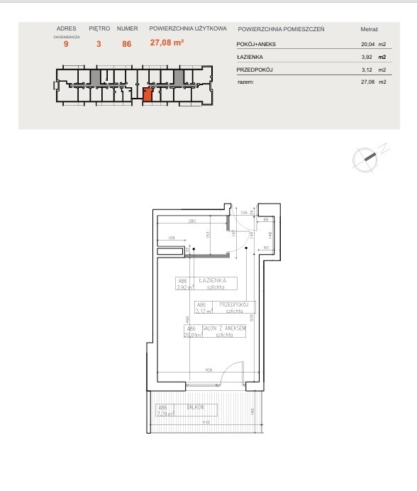 Powierzchnia użytkowa o metrażu 27,08 m² obejmuje: