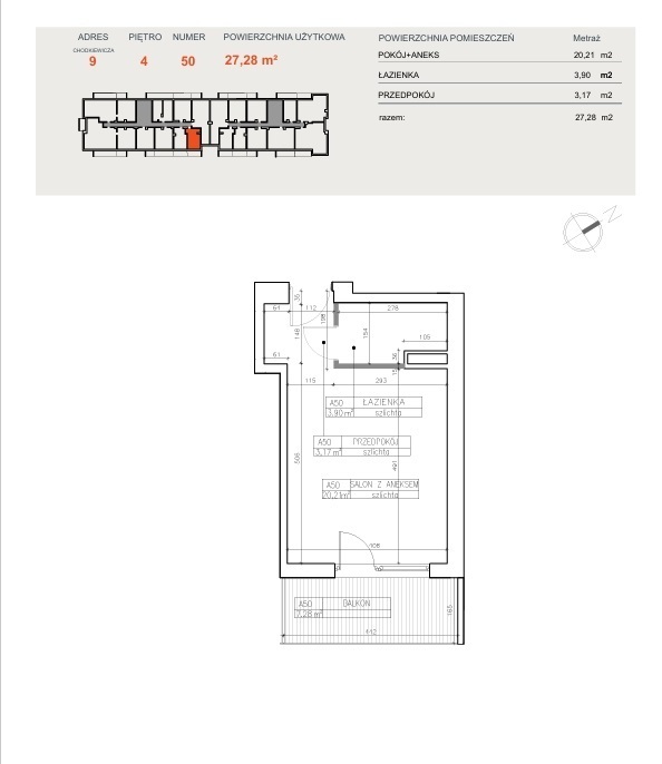 Powierzchnia użytkowa o metrażu 27,28 m² obejmuje: