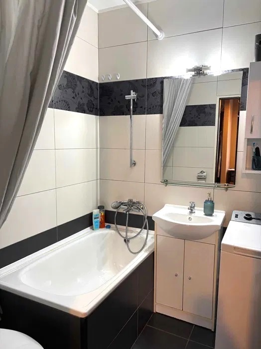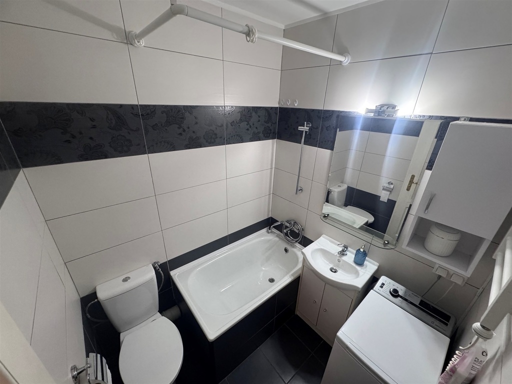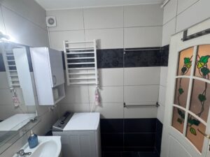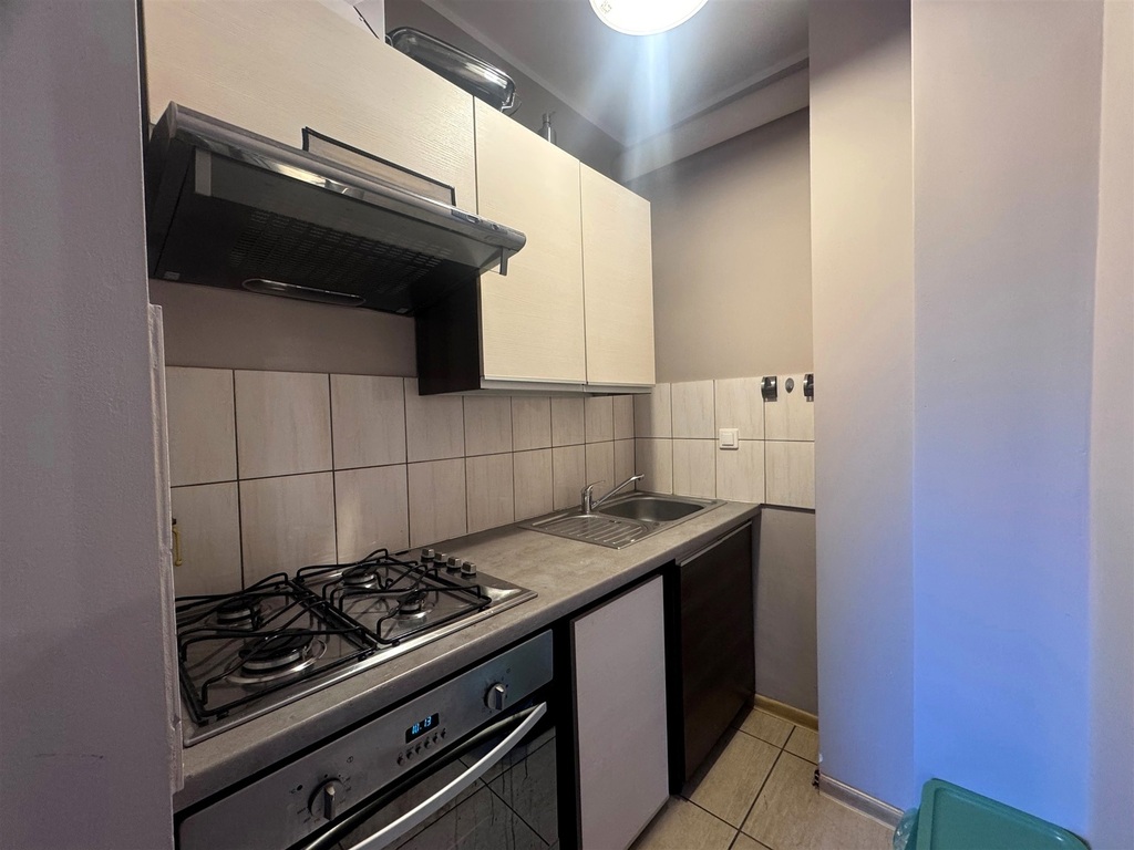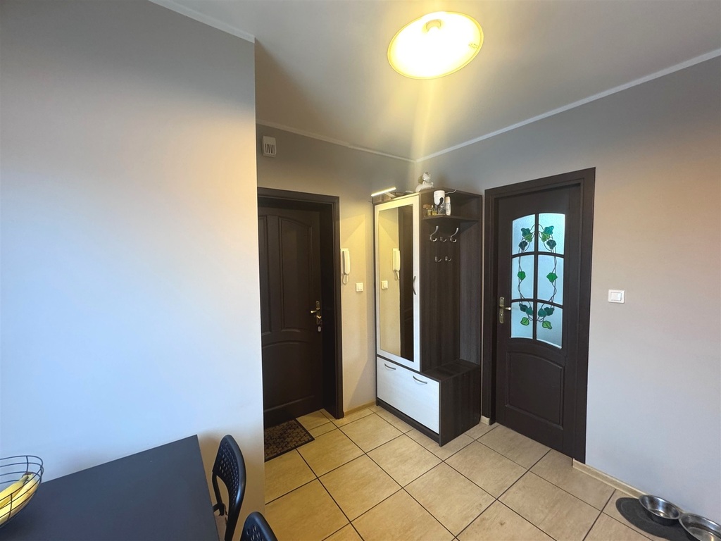 Aneks kuchenny wyposażony jest w zabudowę meblową, zapewniającą wygodę i funkcjonalność. Łazienka sprzedawana jest z pełnym wyposażeniem, w tym z pralką. W korytarzu znajduje się pojemna szafa w zabudowie oraz szafka widoczna na zdjęciach, co zapewnia dodatkowe miejsce do przechowywania.