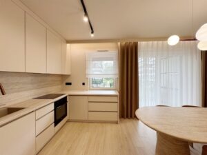 salon połączony z nowoczesną kuchnią, wyposażoną w zabudowę meblową i sprzęty AGD (indukcja, piekarnik, lodówka, zmywarka) o powierzchni 29,23 m2,