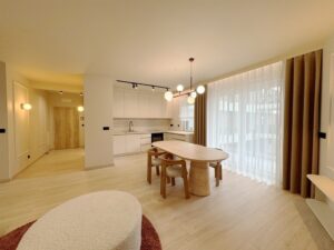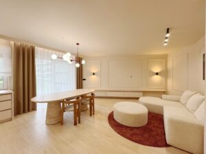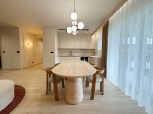 Strefa dzienna zachwyca swoją jasną, lekką kolorystyką, w której dominują ciepłe beże i naturalne drewno, budujące przytulną, harmonijną atmosferę. Geometryczna prostota zabudowy kuchennej została przełamana miękkimi liniami mebli – owalny stół, zaokrąglony stolik kawowy i sofa o łagodnych kształtach wprowadzają do wnętrza subtelną elegancję i poczucie komfortu. Całość dopełniają bordowe akcenty – lampy, dywan i dodatki – które nadają przestrzeni modnego charakteru i wyrazistej osobowości, sprawiając, że wnętrze nabiera indywidualnego, artystycznego sznytu.