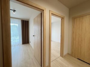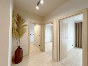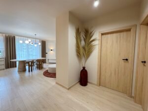 Mieszkanie zostało zaplanowane z naciskiem na komfort i elegancję, gdzie funkcjonalność łączy się z nowoczesnym stylem. Dominują jasne odcienie i naturalne drewno, uzupełnione o subtelne akcenty w neutralnych barwach, które budują spójną, harmonijną przestrzeń. Charakter całości podkreślają modne dodatki w kolorze bordowym, nadając wnętrzom wyrazistości i szyku.