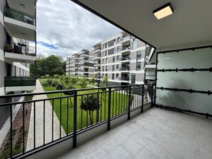 – przestronny balkon w strefie dziennej z widokiem za zielone patio.