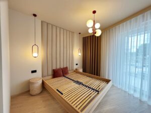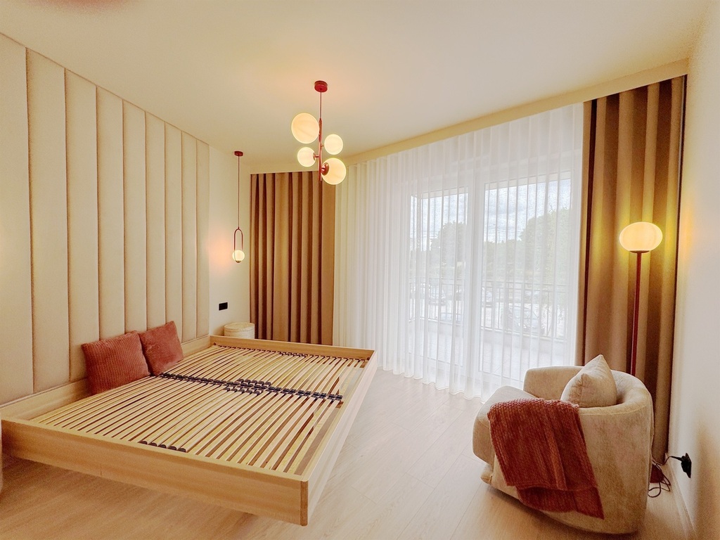Sypialnia to przestrzeń pełna światła dzięki dużym przeszkleniom z wyjściem na balkon. Wyróżniają ją miękkie tapicerowane panele ścienne w odcieniach beżu oraz subtelne, bordowe akcenty w postaci lamp wiszących i dekoracyjnych poduszek. Dzięki temu pomieszczenie zyskuje przyjemny, elegancki klimat sprzyjający relaksowi.