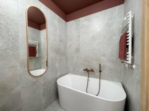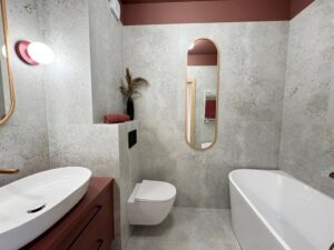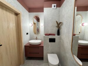 Łazienka zachwyca eleganckim połączeniem jasnych, kamiennych płyt z wyrazistą bordową zabudową i sufitem w tym samym kolorze. Owalne lustra w złotych ramach, nastrojowe kinkiety i czarne dodatki dodają wnętrzu nowoczesnego, ale przytulnego charakteru.
