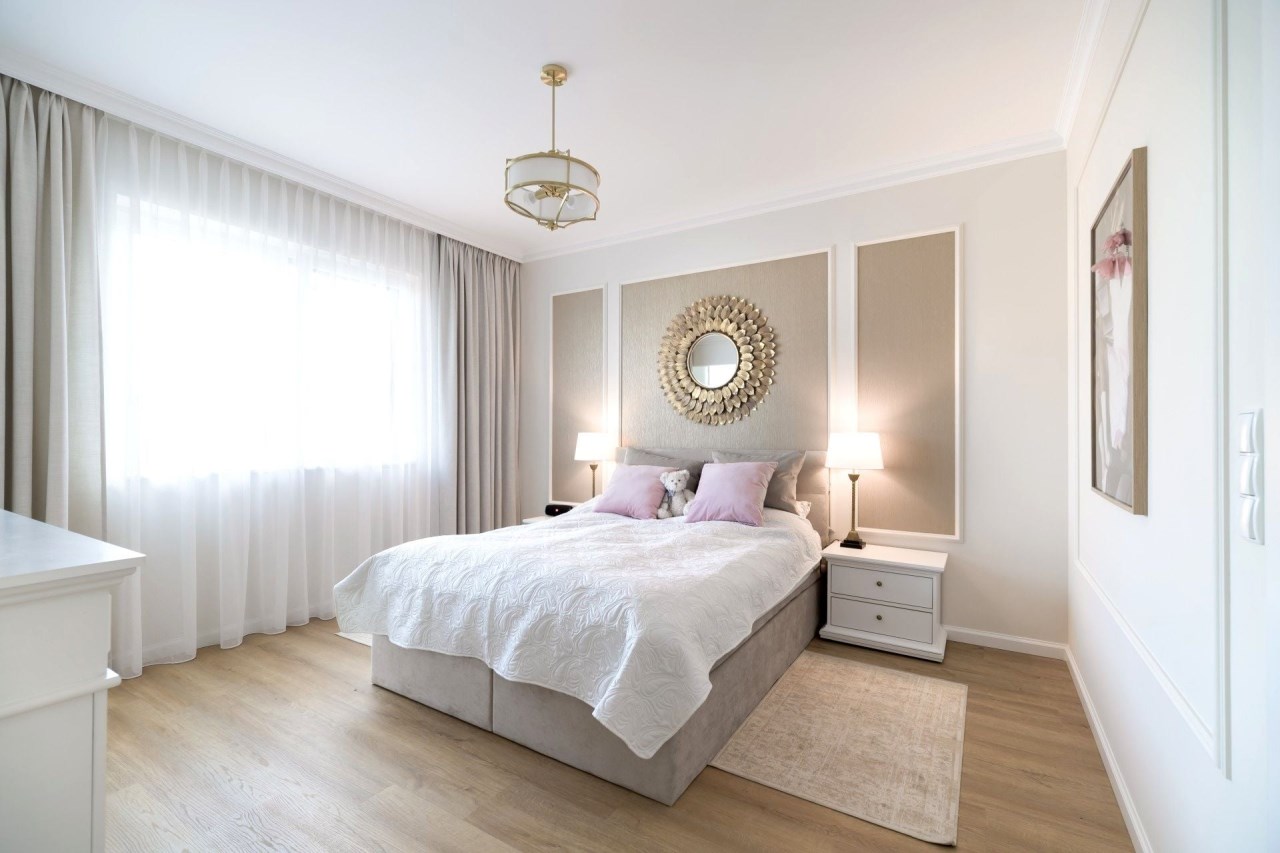 Strefa prywatna obejmuje trzy przestronne sypialnie (od 12,3 m² do 14,3 m²), które z łatwością pomieszczą garderoby, biurka i wszystko, co potrzebne do codziennego komfortu. Duża łazienka oraz dodatkowe WC zapewniają wygodę nawet w godzinach porannego szczytu. Całość dopełnia funkcjonalny wiatrołap oraz garaż wkomponowany w bryłę budynku — bez wychodzenia na zewnątrz, prosto z domu do samochodu.