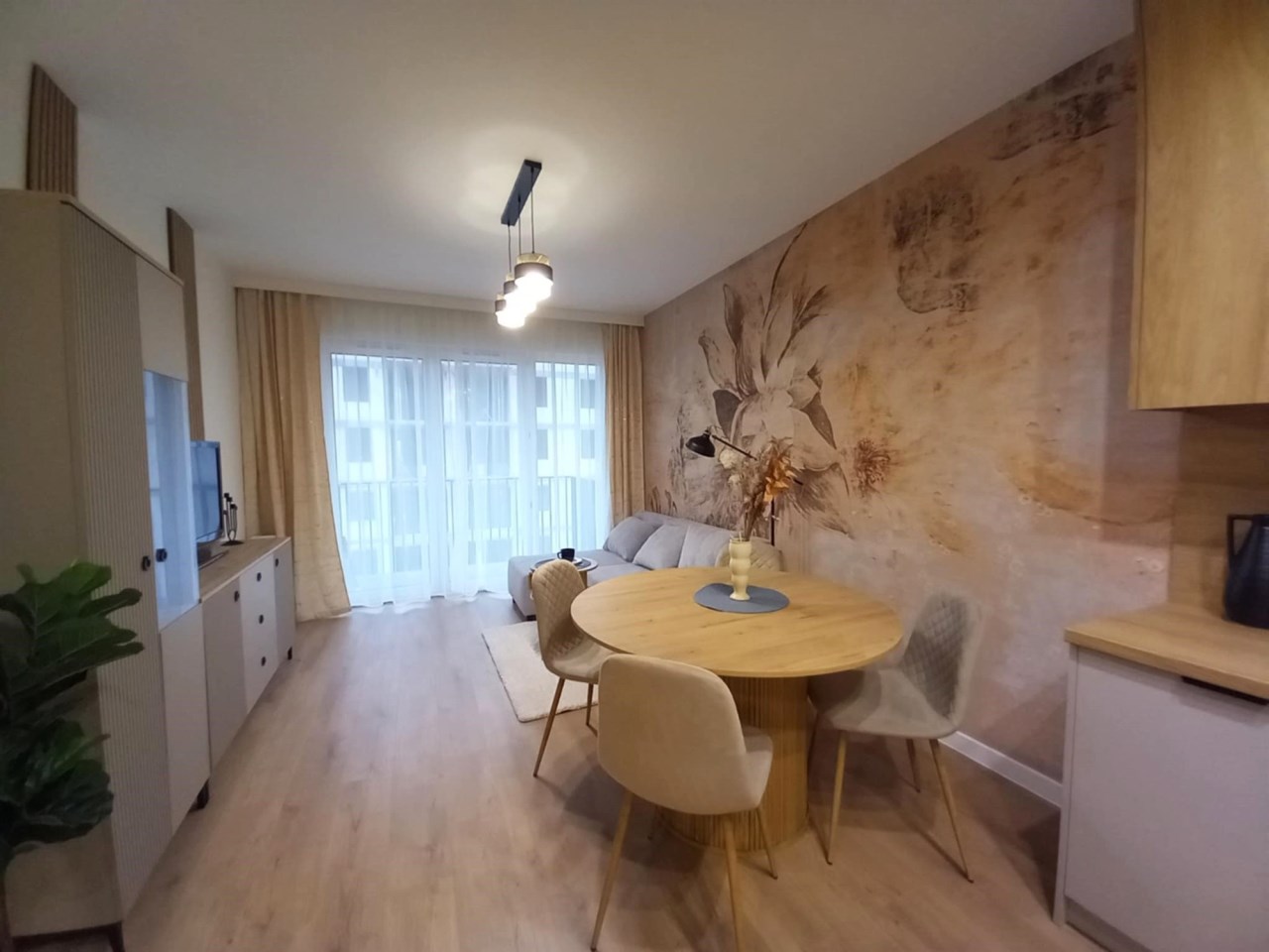 - salonu z aneksem kuchennym – przestrzeń dzienna połączona z kuchnią, dająca poczucie przestronności i funkcjonalności,