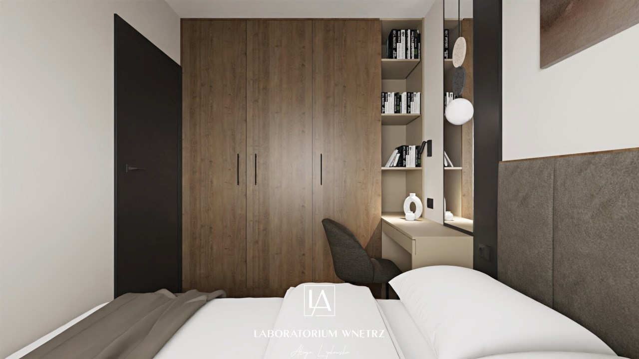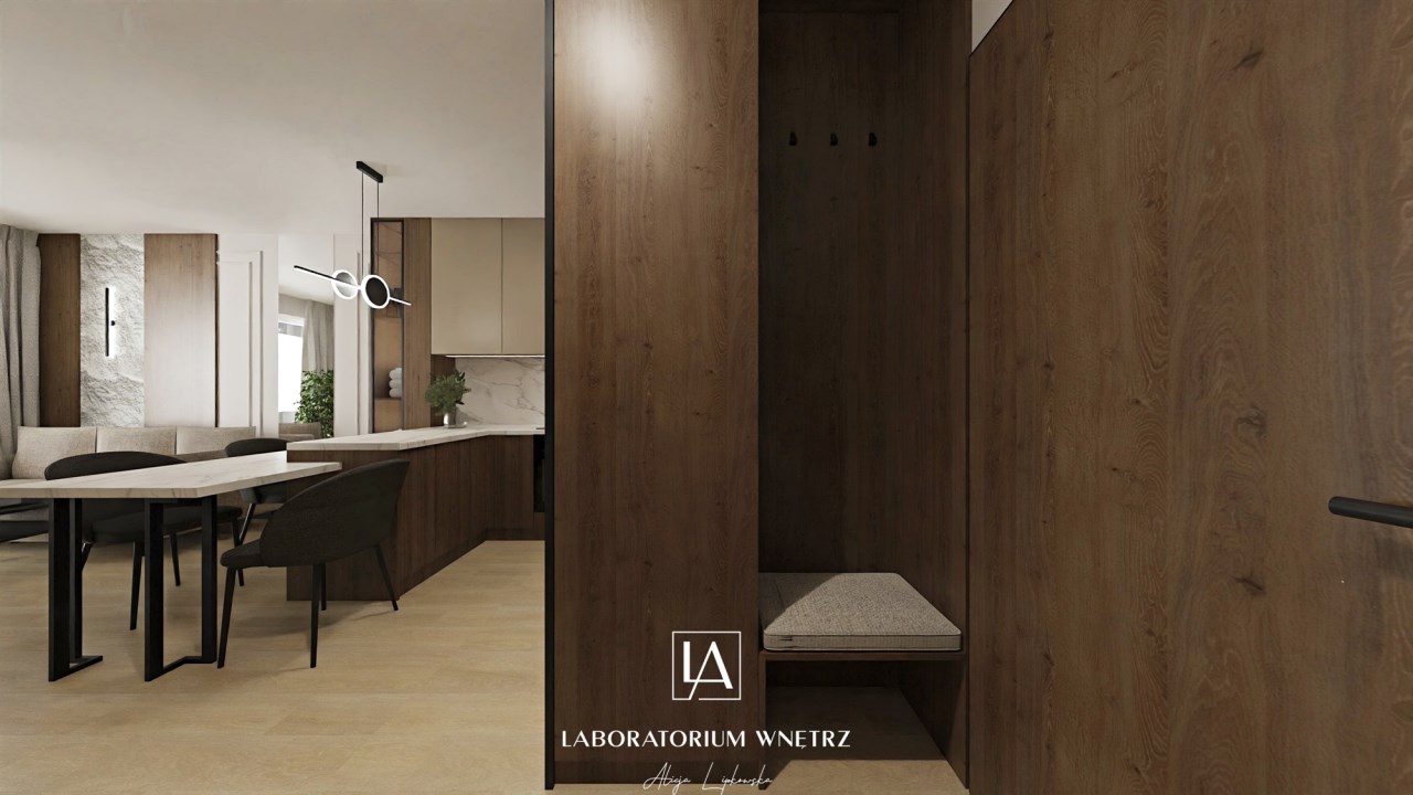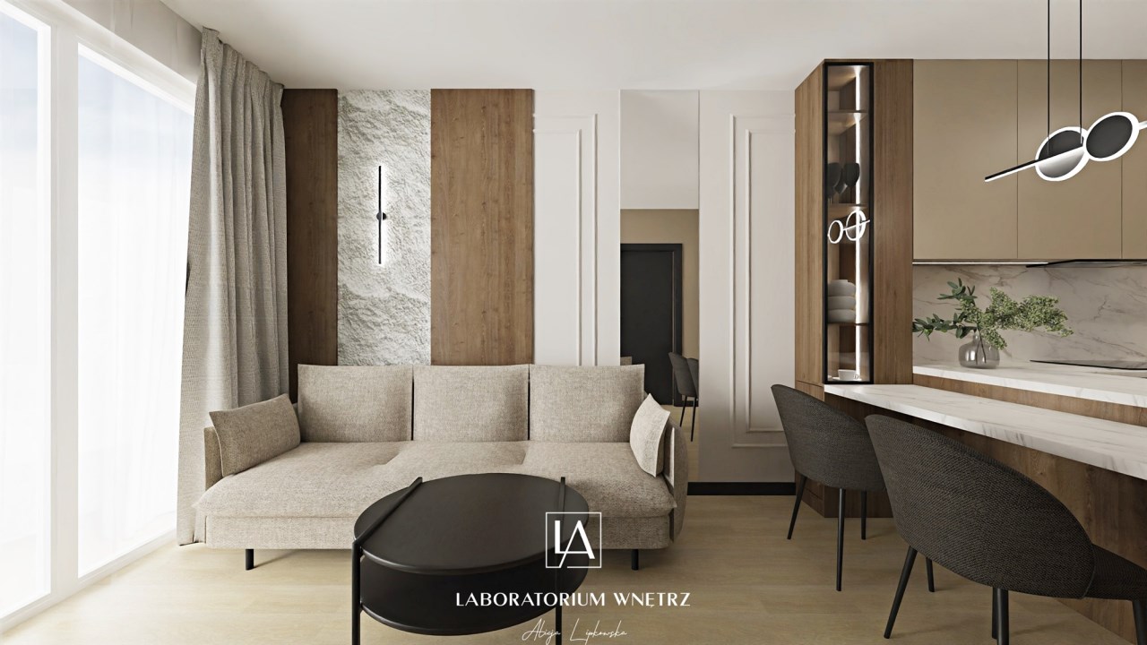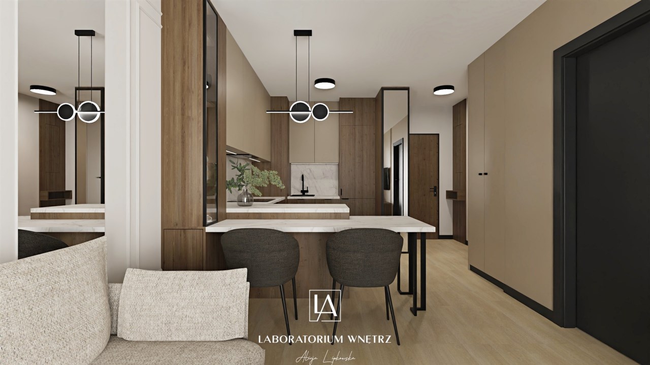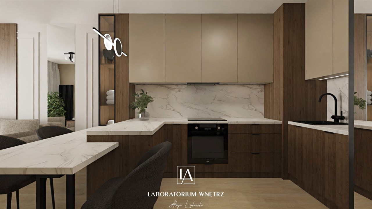 Mieszkanie wykończone w wysokim standardzie, z dużą dbałością o detale i spójną, nowoczesną estetykę. Dominują naturalne materiały, ciemne odcienie drewna, stonowane beże w kolorze cappuccino oraz elegancka czerń w dodatkach. Zabudowy meblowe wykonane na wymiar maksymalnie wykorzystują przestrzeń i zapewniają funkcjonalność.