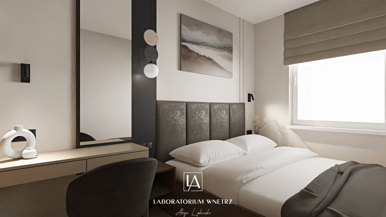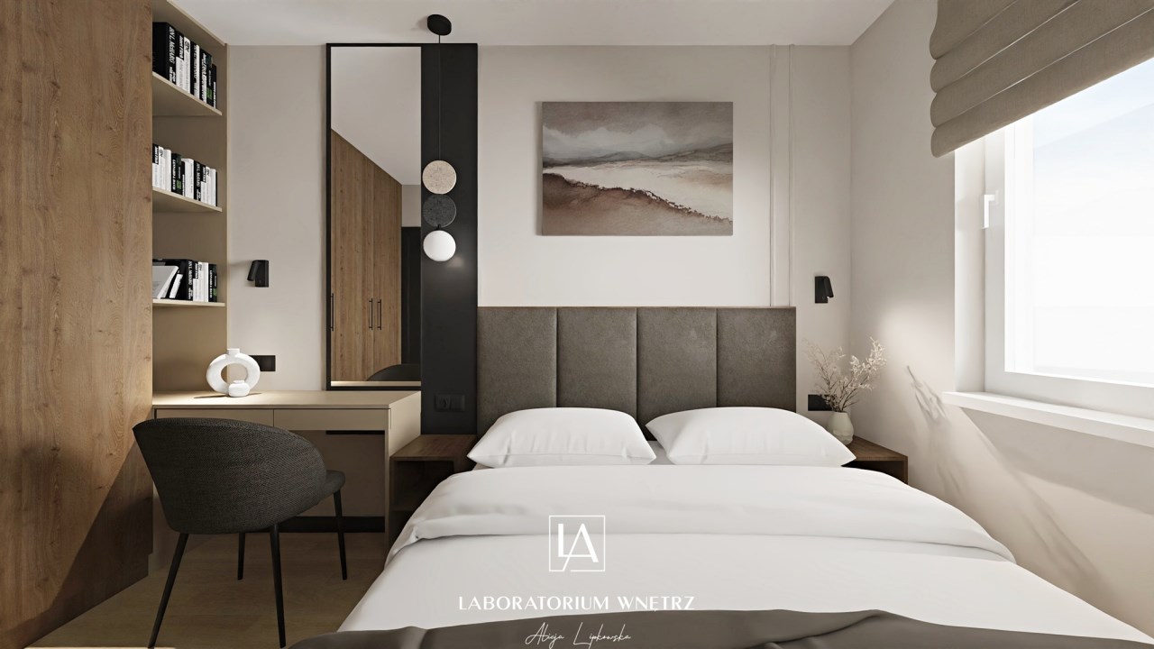 Sypialnia zaprojektowana z myślą o komforcie i spokoju z tapicerowanym wezgłowiem, zabudowaną szafą i nastrojowym oświetleniem.