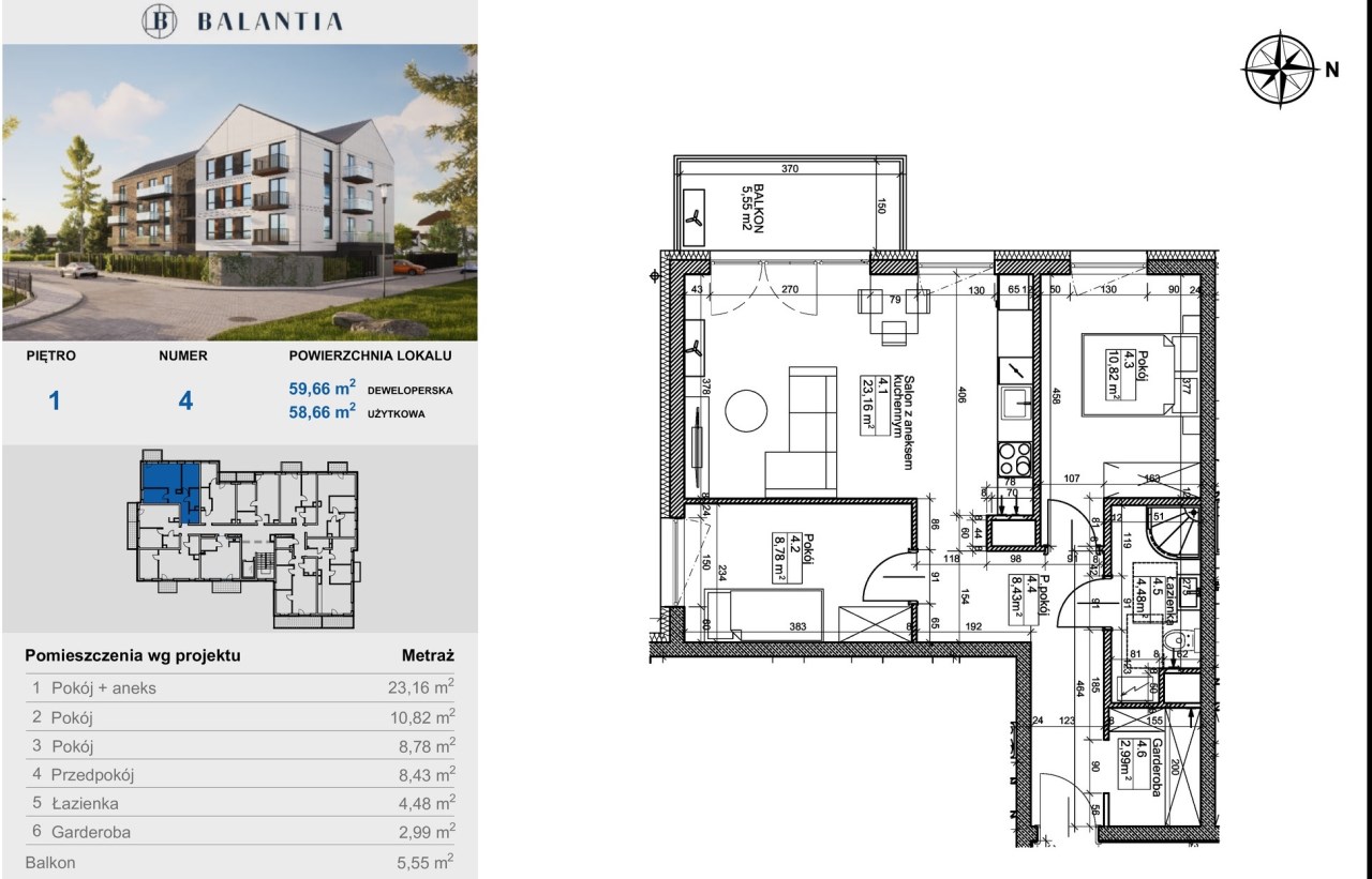 Funkcjonalna przestrzeń 58,66 m² obejmuje: