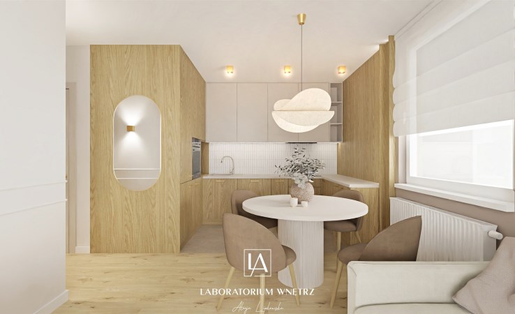 Kuchnia to połączenie jasnego drewna, beżowych frontów, które nadają eleganckiej struktury. Zabudowa wykonana na wymiar sięga aż pod sufit, zwiększając funkcjonalność i estetykę. Duży blat roboczy, czarne akcenty oraz stylowy stół optycznie otwierają przestrzeń i tworzą idealne miejsce do gotowania i codziennego życia.