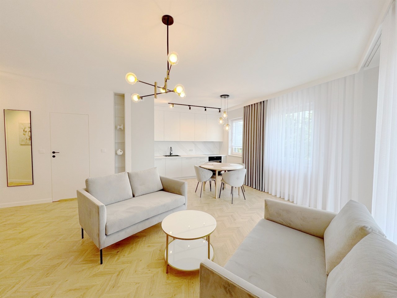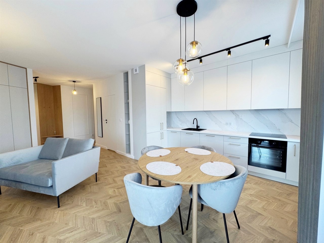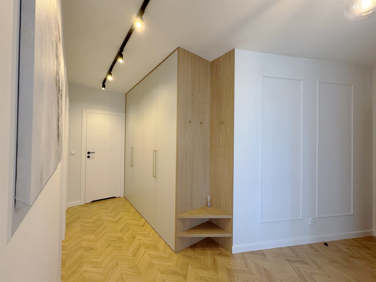 Mieszkanie zostało zaprojektowane z myślą o funkcjonalności i estetyce. Dominują jasne barwy, naturalne drewno i nowoczesne akcenty w neutralnych tonach, które tworzą spójną, elegancką całość. Otwarta strefa dzienna łączy kuchnię, jadalnię i salon, zapewniając przestrzeń idealną do codziennego życia i spotkań z bliskimi.