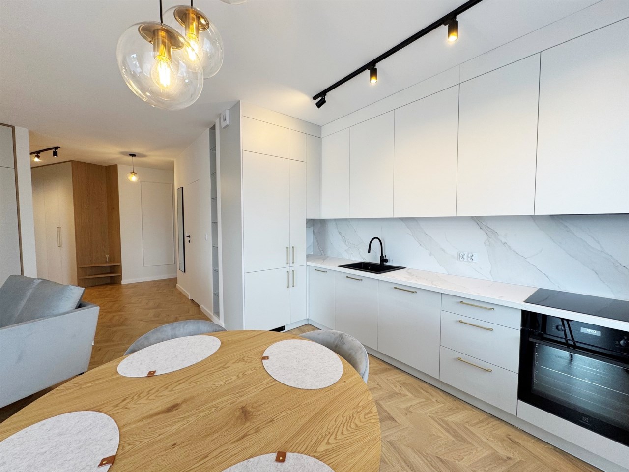 - salon połączony z nowoczesną kuchnią, wyposażoną w zabudowę meblową i sprzęty AGD (indukcja, piekarnik, lodówka, zmywarka) o powierzchni 30,43 m2 z wyjściem na balkon,